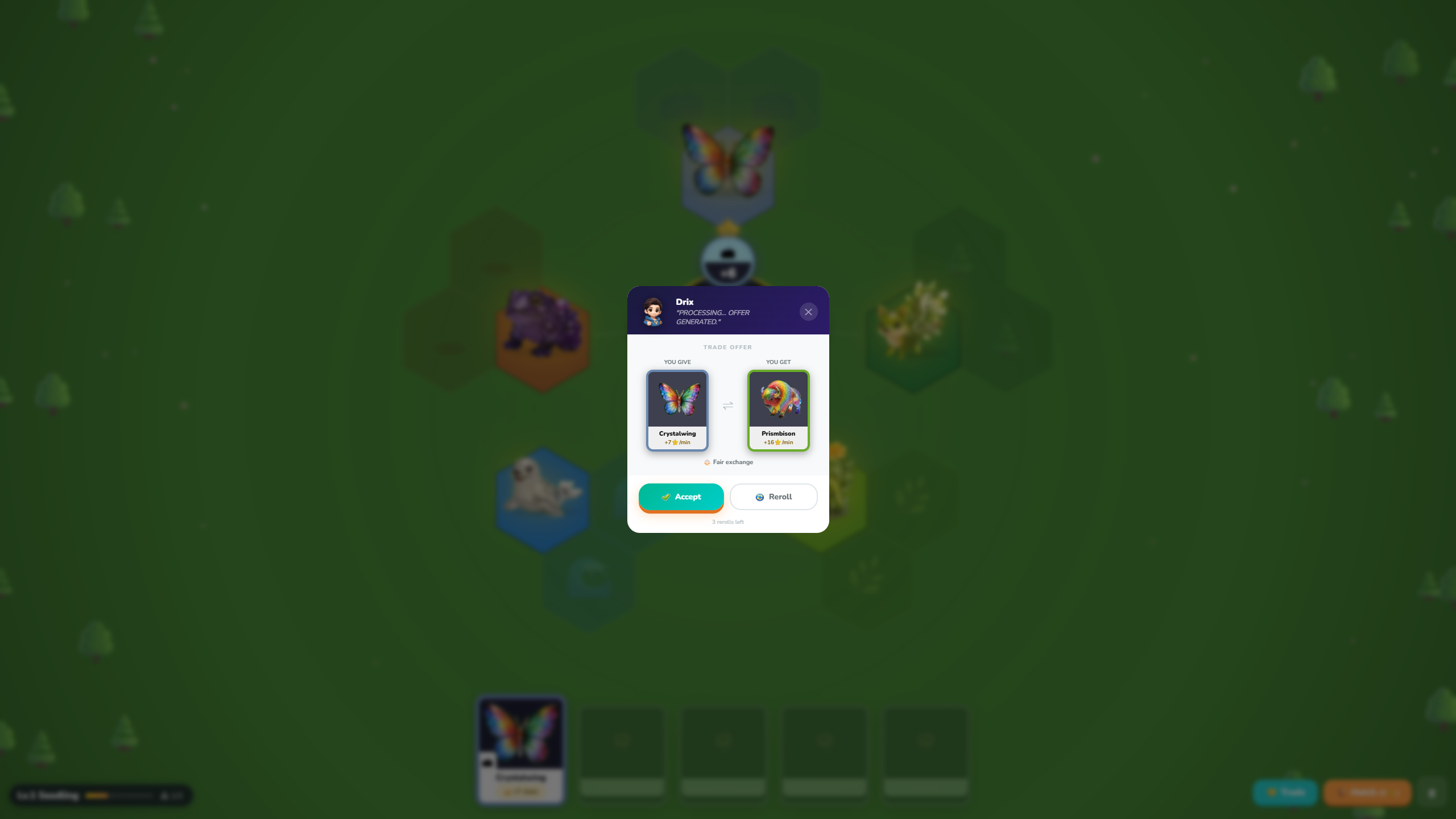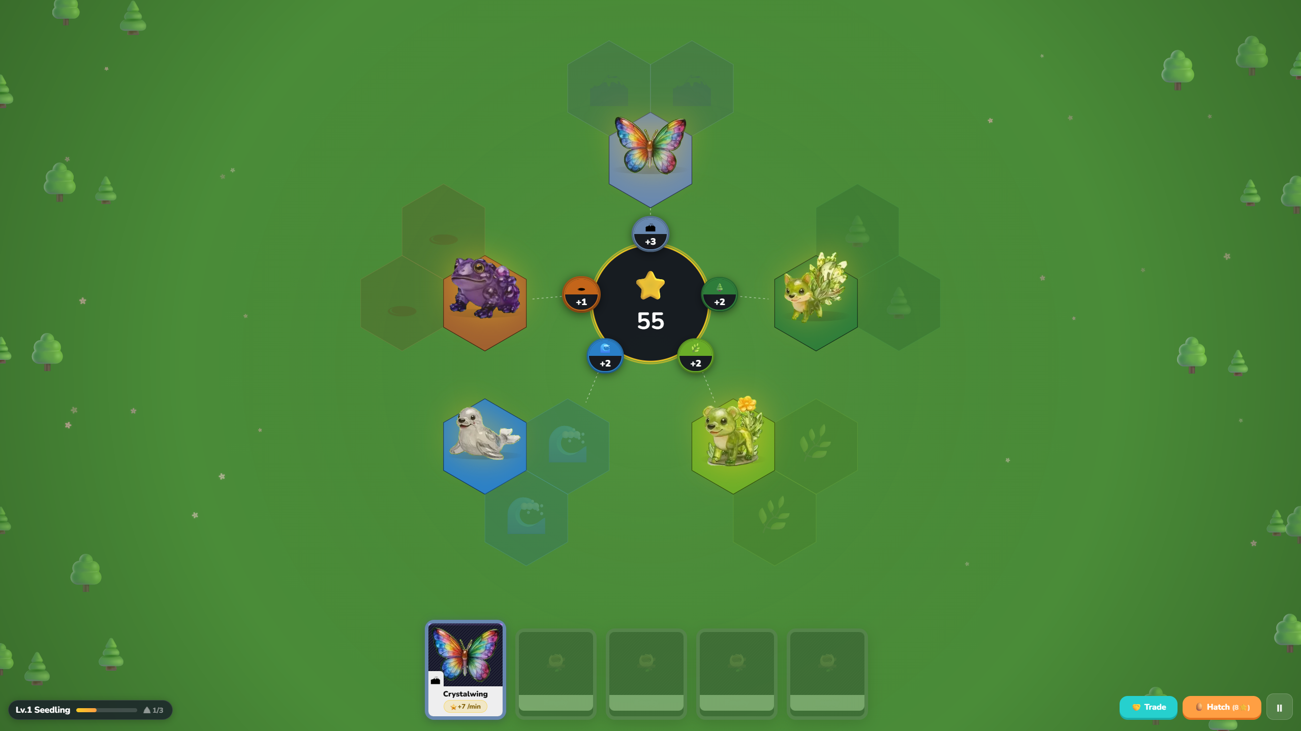 I really liked the creature designs / artwork, and the overall pacing felt pretty good (up until everything got erased; at that point I gave up.) The random egg spawns and trades felt interesting. I had some troubles actually getting some of the cards/critters to go onto the board, especially into the spaces close to your hand of cards. Also I was concerned about filling up all the spaces before I realized you could take creatures back into your hand and you got board expansions for filling everything. How exactly the upgraded ones spawn I wasn't clear on either but I believe it's when you have a triple and expand the board. Overall I liked what I've seen so far other than the most unfortunate loss of all progress. I didn't even think to snap a screenshot, RIP shiny blue legendary deer.