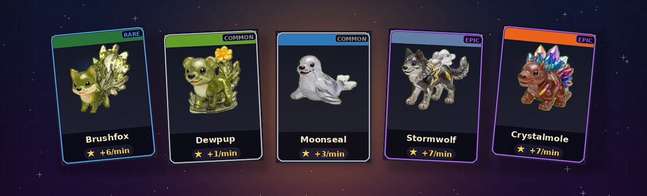 From Common to Celestial and Eternal, every rarity tier looks and earns differently. The higher the tier, the harder to hatch — and the more stars they pour in.