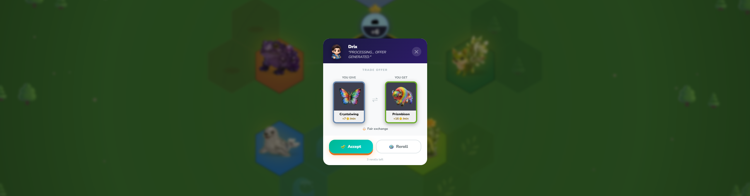Each trade brings a random merchant — haggle with Mira, Kael, and others to swap a Nestori for something rarer. Reroll the offer up to three times. Trading is often the fastest route to filling a biome or landing a legendary you've never seen hatched.